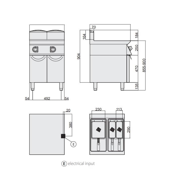 - напольная фритюрница на закрытой подставке с регулируемыми ножками от 855 до 900 мм;