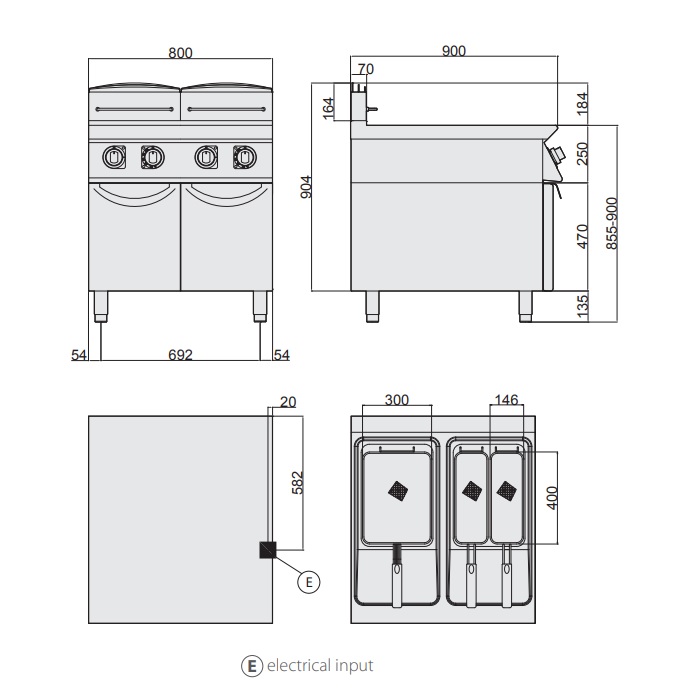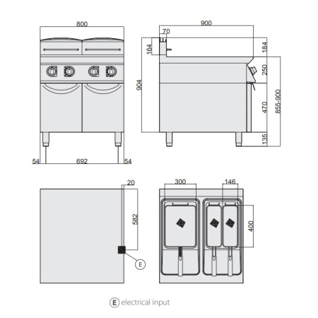 - напольная фритюрница на закрытой подставке с регулируемыми ножками от 855 до 900 мм;