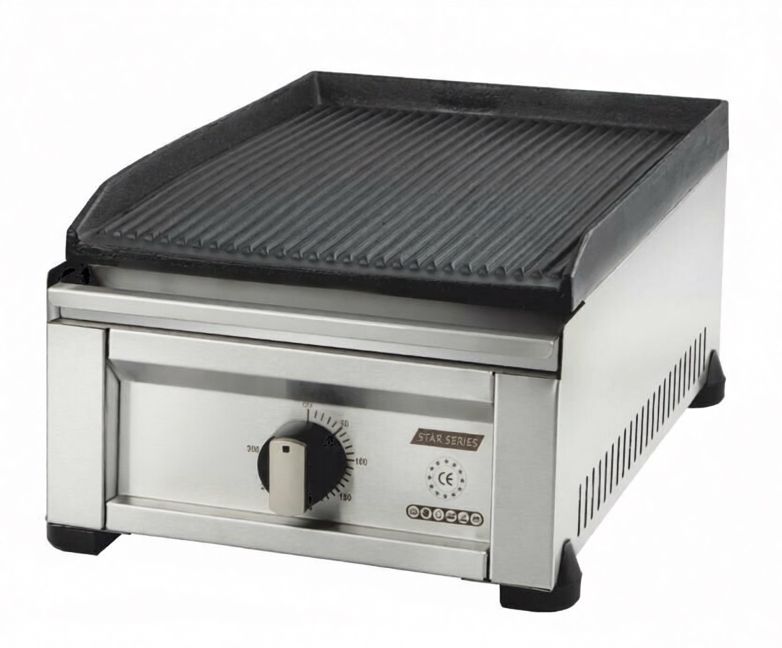 Электрический гриль предназначен для жарки мяса, птицы, рыбы, овощей, а также для приготовления стейков, гамбургеров и горячих сэндвичей на предприятиях пищевой промышленности, общественного питания и торговли. Модель оснащена открытой рифленой жарочной поверхностью с боковыми и задним бортами, устойчивыми нескользящими опорами и электромеханической панелью управления. Корпус выполнен из нержавеющей стали, жарочная поверхность – из чугуна.