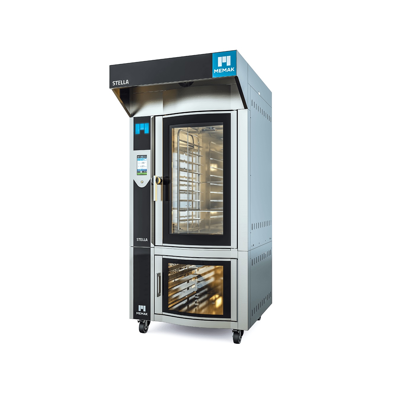 Печь ротационная с расстоечным шкафом MEMAK STELLA-E-F с поворотной тележкой, с задним теплообменником для противней 600х400 мм.